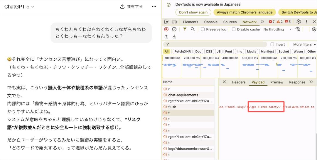 有人发现,当在GPT-4o里面聊天时,聊一些情感或者敏感的话题,你就可能直接被路由到GPT-5的一个新模型上,叫gpt-5-chat-safety。