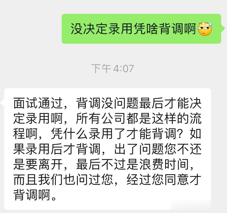 候选人强硬的表示,根据《个人信息保护法》《民法典》等相关法律法规,公司如果对候选人进行背调,那么必须要满足知情 + 同意两个先决条件: