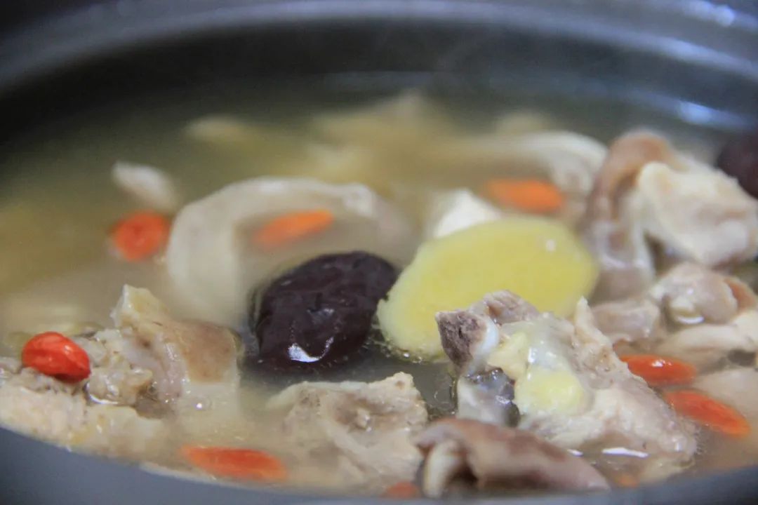 煮开后,把食材倒入电饭锅,加入莲子,红枣,鸡块(如果是嫩鸡可以晚些加),按电饭锅的炖汤键。