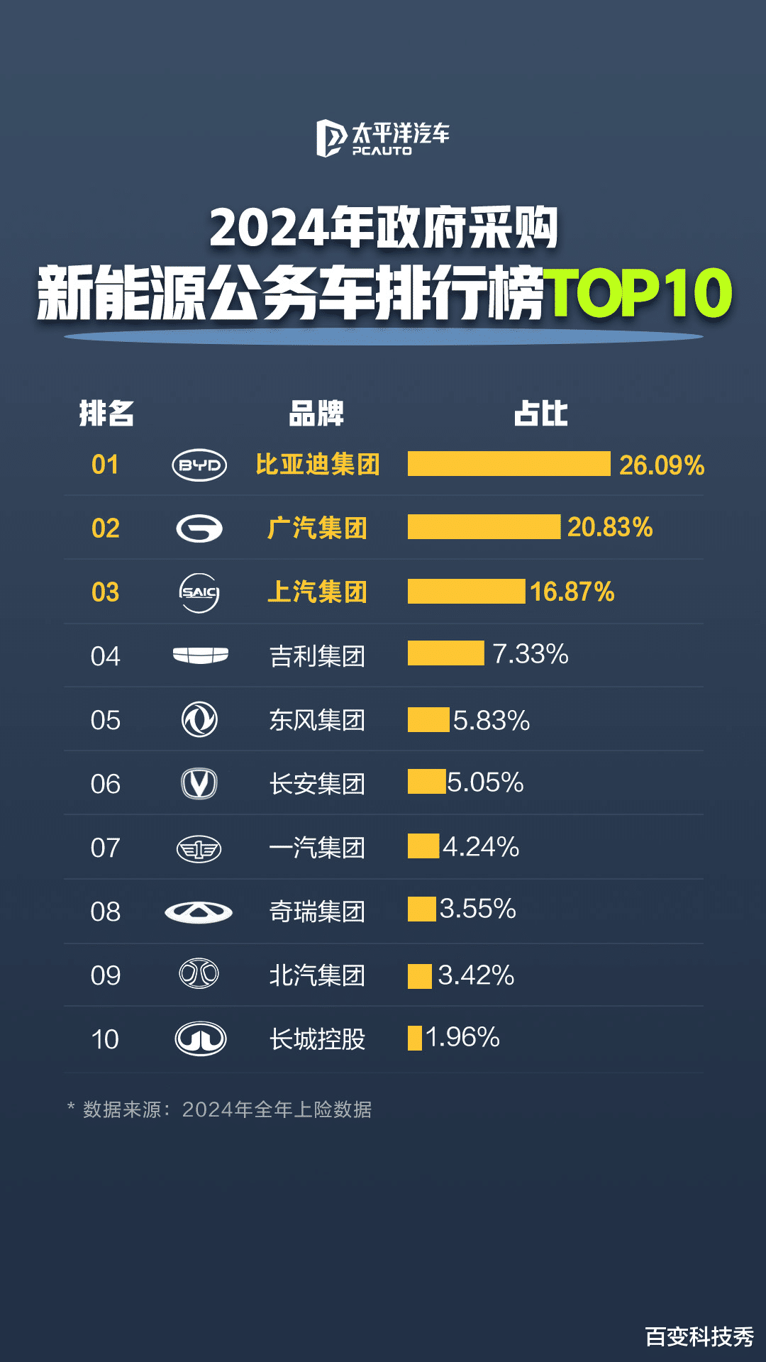 从23年开始,在政府采购新能源公务车数据里面,比亚迪已经连续2年稳坐采购榜冠军了,今年上半年的占比更是达到了28.21%,相当于每三台里就有一台是比亚迪,不夸张的说比亚迪成体制人严选车型了