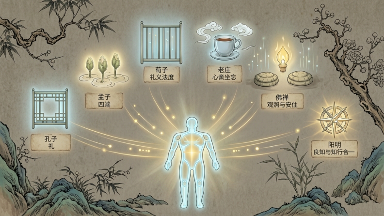 荀子为什么讲礼义法度?因为欲会把人拖偏,心需要护栏。老庄为什么讲心斋坐忘?因为心太满、太紧、太执,必须松解。佛禅为什么讲观照与安住?因为心会不断制造苦,必须看见其机制。