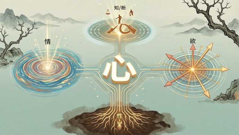 “心”,则更像统摄这些层面的中轴与枢纽。它既会受情和欲牵动,也可以对情和欲作出判断、调节、安放和组织。它像“中枢”。如果用一个很简明的比喻来讲,就是:性,像根底。情,像波动。欲,像驱动。心,像中枢。