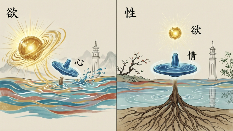 “情”,更偏向心被事物触动之后发出的感应。高兴、愤怒、悲伤、恐惧、感动、怨怼,这些都可以归在情的层面。它像“波动”。“欲”,更偏向趋求、占有、满足、自我延伸的动力。想拥有、想得到、想抓住、想避免失去,这些都更接近欲。它像“驱动”。