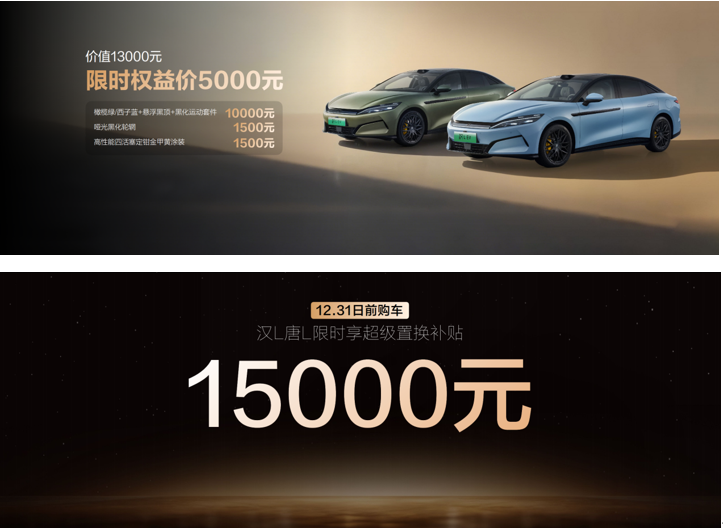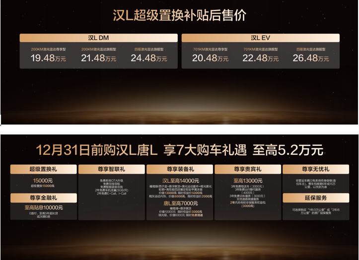 此次,汉L EV共带来3款车型,补贴后售价20.48万~26.48万元;汉L DM 3款车型,补贴后售价19.48万~24.48万元;同时,比亚迪还为用户准备了包含置换补贴在内的至高价值5.2万元尊享礼遇。(以上权益截至12月31日)