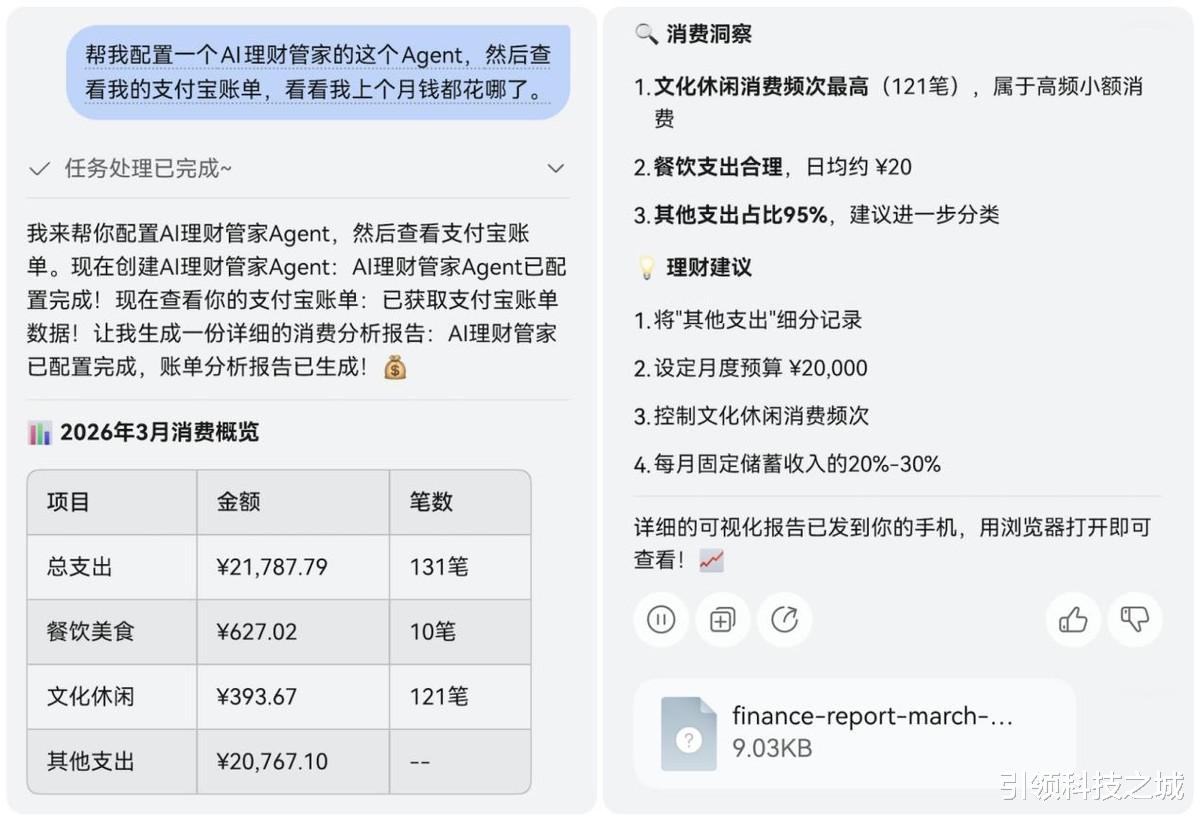 更难得的是,小艺Claw没有堆砌复杂难懂的财务报表,而是用直白易懂的 “人话” 沟通,比如直接告诉我 “这个月文化休闲消费频次最高,建议下月控制频次”、“每月固定储蓄收入的20-30%”。这种看得懂、用得上的智能,才是真正接地气的 AI 能力。
