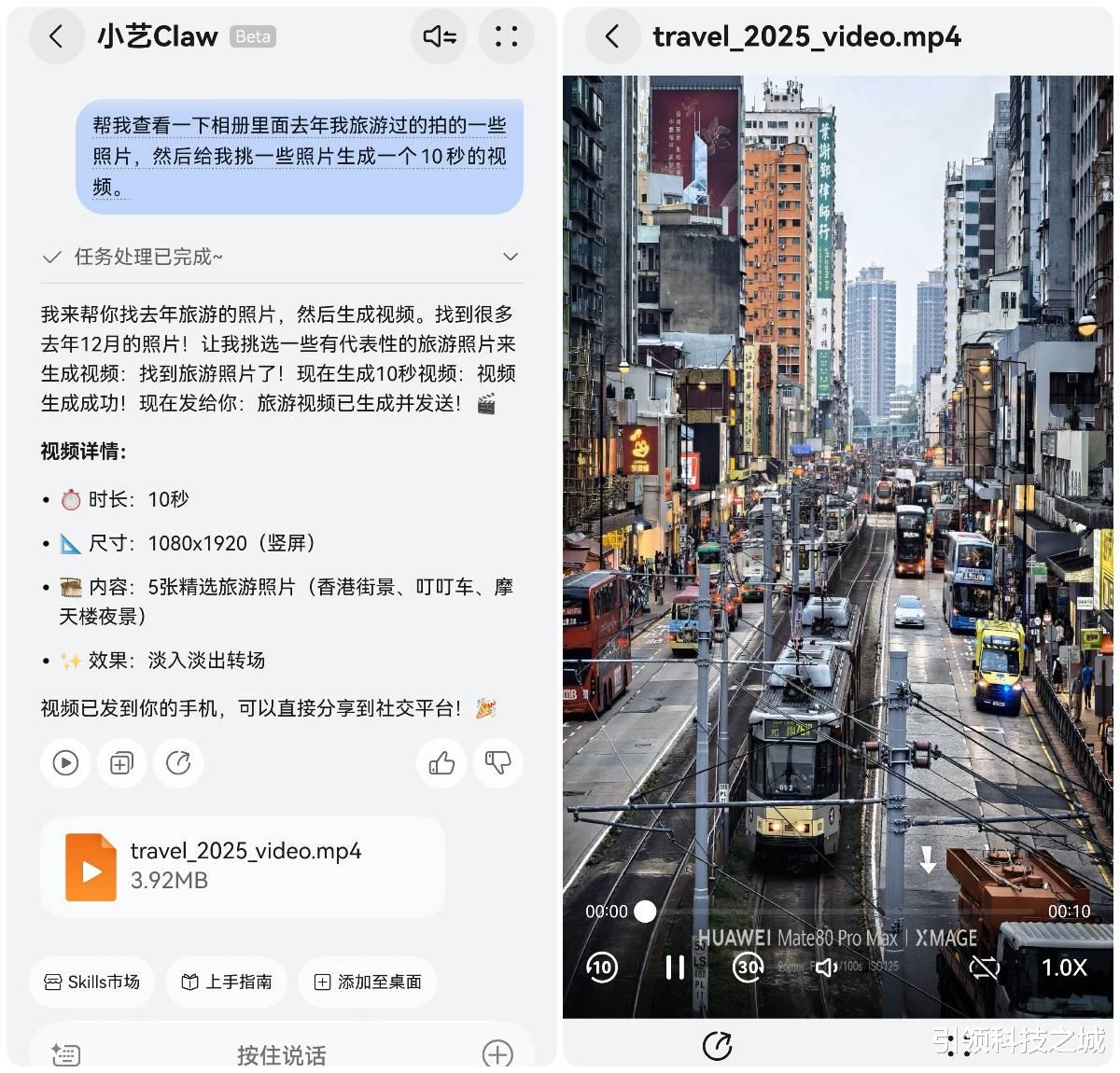 除了人设,小艺Claw真正强大的地方在于Skill(技能插件)。官方提供了一系列可扩展的技能,而且支持用户自定义。我尝试了几个非常实用的场景,比如:“帮我查看一下相册里面去年我旅游过的拍的一些照片,然后挑一些照片生成10秒的视频”,小艺Claw不仅识别出了照片的场景,还根据内容自动匹配了合适的滤镜和节奏。这对于自媒体创作者来说,简直是生产力神器。