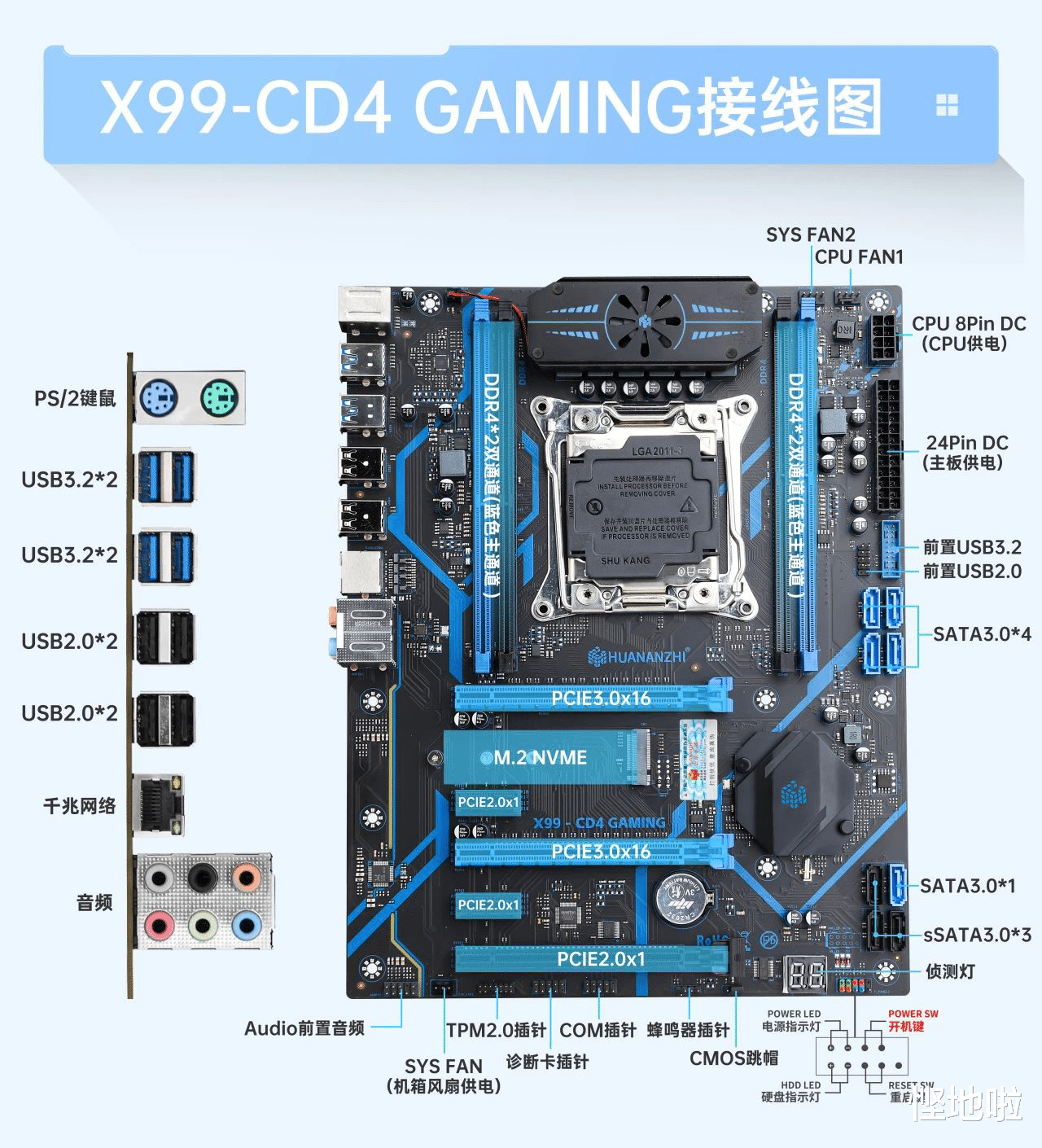 【前言】作为国内主板销售量遥遥领先的品牌,华南金牌在主板性能迭代方面也很给力,比如卖得很好的X99系列主板,最近又发布了两款拓展丰富的高性价比主板——X99-CD3 GAMING和X99-CD4 GAMING,分别对应支持DDR3和DDR4内存。刚好最近PO主想给主机升升级,就入手了一块X99-CD4 GAMING主板试试水,虽然CD3/CD4产品售价一样,不过考虑到DDR3内存现在基本被淘汰了,加上手头还有几条DDR4内存可以无缝切换,就直接选CD4版本了。