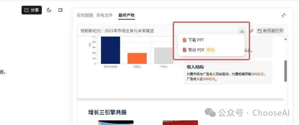 第二个独到之处便是它能自动生成框架全面、逻辑严谨、数据无误、自带图表、排版美观的ppt。