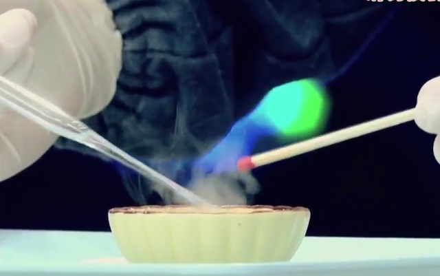 实验在实验中,可以看到桌子上准备的物品很简单,只有三种:一个放置滴管的盛水量杯、一个放有白色粉末的小碗,以及一盒普通的火柴。实验开始时,科学家先是用滴管从盛水的量杯中引出几滴水,再拿出一根火柴放置停留在放有白色粉末的小碗上方,最后再将滴管中的水滴到小碗中。可以看到瞬间引起了烟雾,然后产生了急促地火光,最后将火柴引燃,从而整个流程实现了用水引燃火柴。