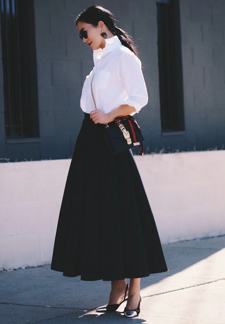 白衬衫搭配黑色长裙与白色靴子,展现出简约而不失格调的气质,白色靴子不仅能够增加身高,还能与白衬衫形成呼应,展现出优雅的气质。