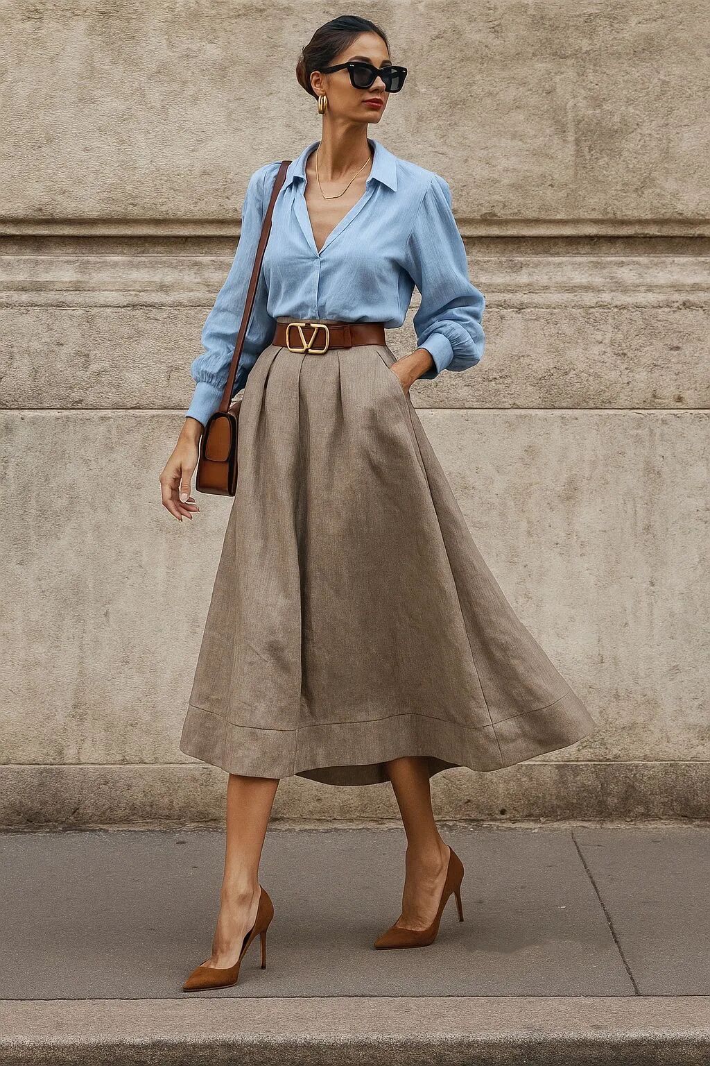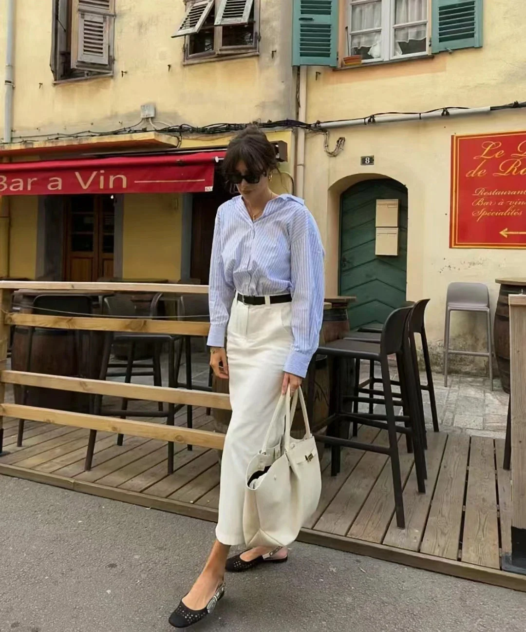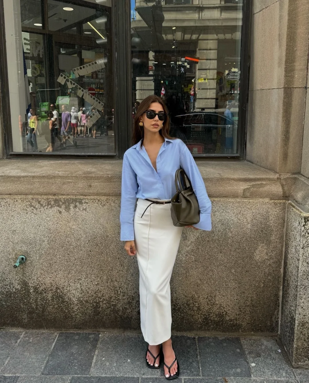 当蓝色衬衫邂逅黑色直筒长裙,少了几分包臀裙的曲线张力,却多了份直筒剪裁特有的利落与大气,高级感在简约中愈发凸显。