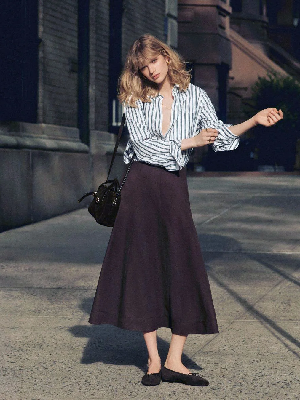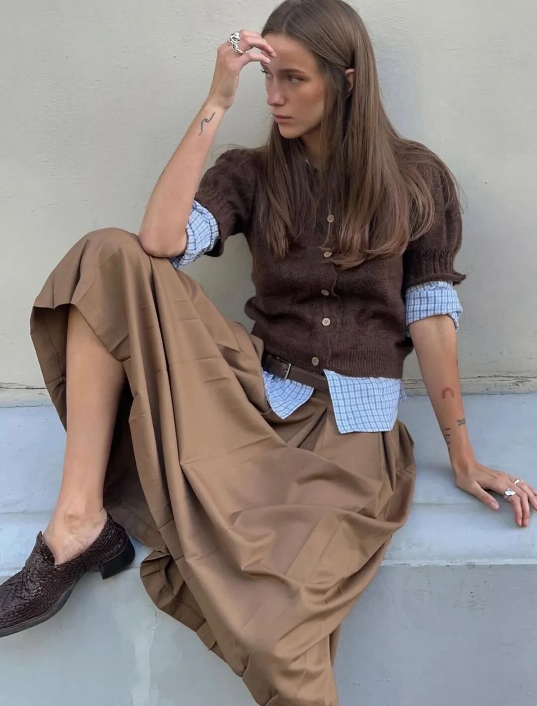 换成简约的基础款白衬衫,配棕色直筒长裙,白与棕的组合,既有老钱风特有的低调贵气,又藏着女性独有的柔美肌理,无论是出席轻商务场合,还是赴一场秋日下午茶,都能让人在从容中尽显品味,每一处细节都透着 “精致却不刻意” 的优雅。