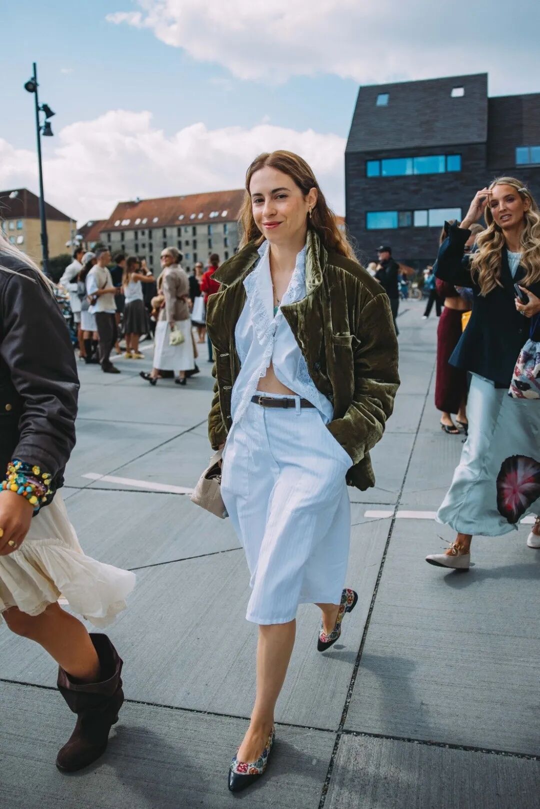 蓝色衬衫里悄悄藏进一件白色 T 恤,是日常穿搭里最不费力的巧思。露出 T 恤,像把秋日的晴空与云朵穿在了身上。下装搭配一条卡其色短裙,更是将这份松弛感拉满。