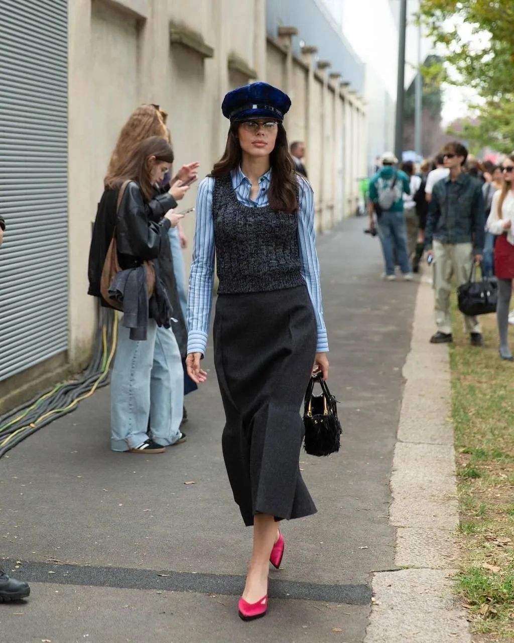 将裙子换成灰色百褶短裙,,比蓝黑配多了几分柔和的灵动,却依旧藏着不费力的高级感。