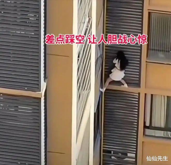 然而女子每一次的尝试看起来都是十分惊险,每一次的挪步都有掉下去的可能,这让在楼对面看到这一切的网友内心也不禁捏了一把汗。