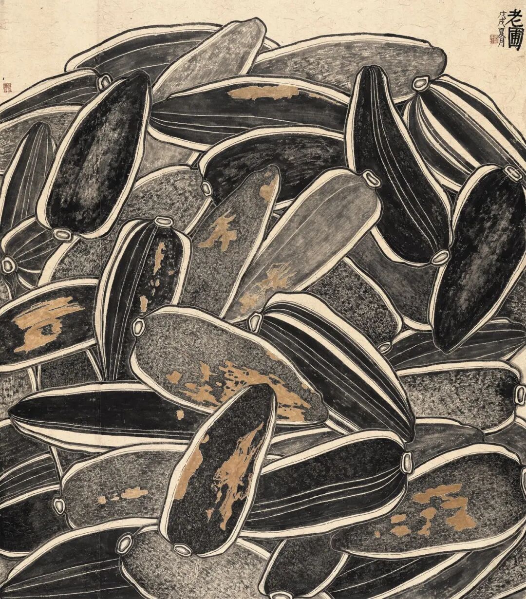 他的用笔,堪称“写”的典范。中国画的核心是“写意”,而“写”的本质是书法用笔。老圃先生的线条,没有丝毫的犹豫与雕琢,全然是心迹的自然流淌。勾勒一枚南瓜的外轮廓时,那根线条时而沉稳厚重,如锥画沙;时而轻盈灵动,如春蚕吐丝。一根线条的起、行、转、收,充满了节奏与韵律,它不仅是造型的手段,其本身就是一种独立的审美对象,承载着画家的情绪与修养。