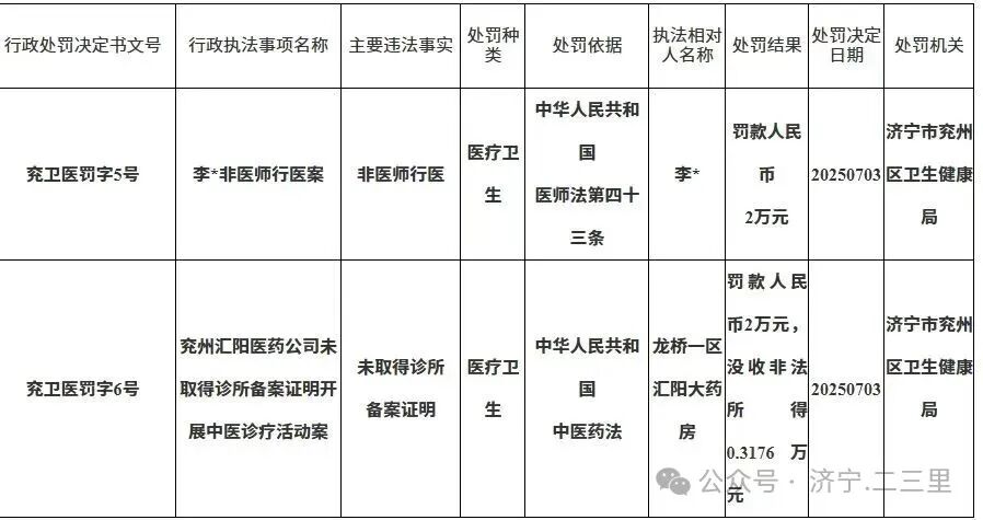 针对兖州汇阳医药公司未取得诊所备案证明开展中医诊疗活动的违法行为,区卫生健康局依据《中华人民共和国中医药法》相关条款,依法作出“罚款人民币2万元,没收非法所得0.3176万元”的处罚决定,处罚日期同为2025年7月3日。