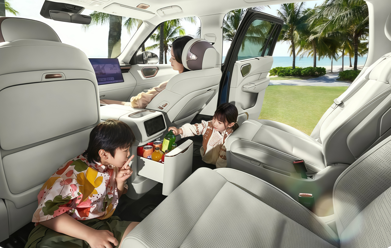 在空间设计上,领克900精准解决了“看着大坐着挤”的问题。它基于SPA Evo架构打造,车身长度超5.2米,轴距突破3米,内部空间达到6.16㎡,得房率高达88.2%,让空间利用率远超不少同类型车型。二排座椅配备550mm超长滑轨,三排拥有125mm滑动空间且支持最大155°后仰,成年人乘坐时腿部能有充足活动空间,避免久坐疲劳;后排纯平地板设计,方便孩子在车内安全移动,也消除了家长对孩子乘坐安全性的顾虑。同时,车辆配备双180°电动可旋转座椅,可快速切换为“移动会客厅”模式,搭配能承重300kg的天地门设计,无论是日常家庭出行,还是露营、垂钓等户外场景,都能灵活适配。