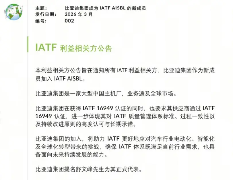 IATF是全球汽车质量管理体系的权威组织,长期以来成员以欧美车企为主,如宝马集团、福特汽车公司、通用汽车、大众汽车公司、沃尔沃集团等。此次比亚迪经汽车工业行动集团(AIAG)提名推荐,并经IATF全体成员投票通过,正式成为行业标准制定者的一员,既彰显中国汽车产业的全球影响力,也印证其核心技术与质量管理水平获国际认可。IATF官方公告称:“比亚迪集团的加入,将助力 IATF 更好地应对汽车行业电动化、智能化及全球化转型带来的挑战,确保IATF 体系既满足当前行业需求,也具备面向未来持续发展的能力。”
