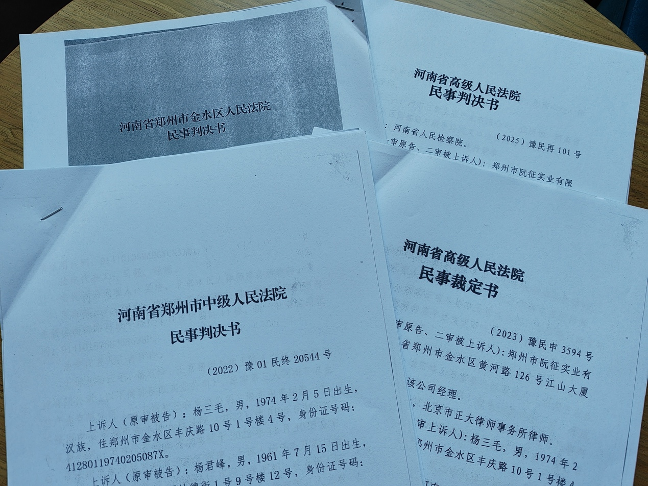 据杨某反映,她父亲杨某峰,母亲王某菊因陷入一场“翻烧饼”式司法纠纷案件中。一审郑州市金水区人民法院(简称金水区法院)判决他们败诉,二审郑州市中级人民法院(简称郑州中院)做出终审判决他们胜诉,2023年9月28日,河南省高级人民法院(简称河南省高院)做出裁定驳回了阮征公司的再审申请。
