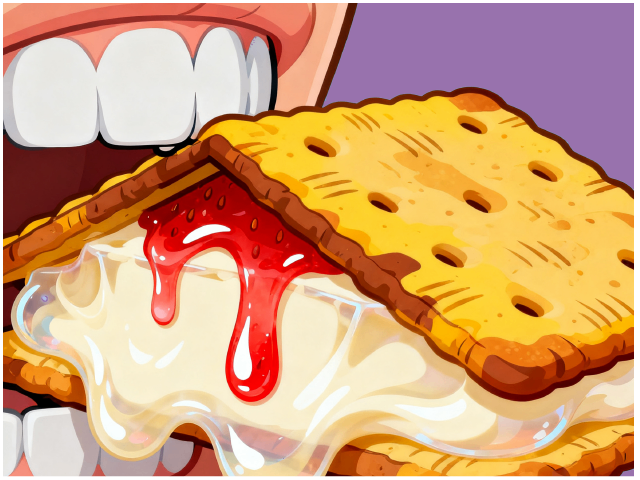 牙齿轻触饼干屋顶时,先是焦香脆壳奏响迎宾曲,随即陷入牛轧糖的柔软蹦床,草莓酱突然从中间滑过,在味蕾上画出酸甜的弧线。