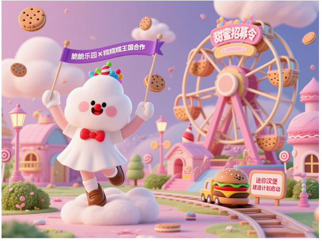 穿着奶白蓬蓬裙的牛轧糖小丑,从棉花糖云朵里翻着跟头登场:“通知!脆脆乐园与糯糯王国达成合作”,“立即启动迷你汉堡建造计划——”