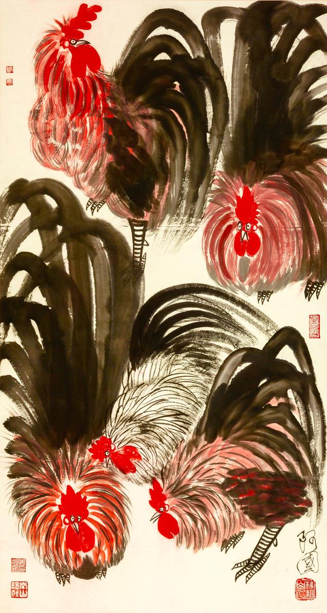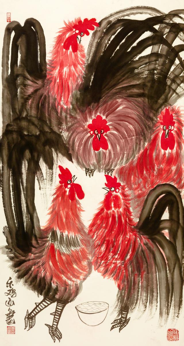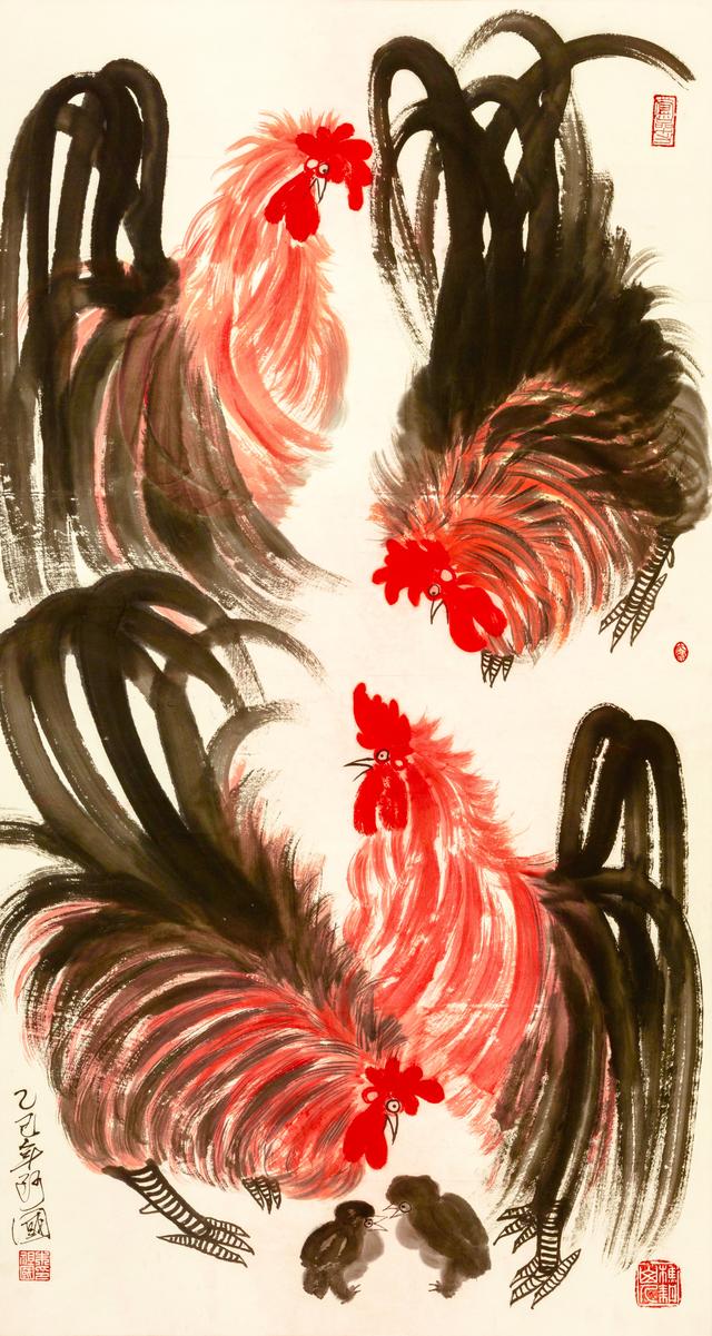 朱祖国笔下的鸡,早已超越了传统花鸟画的范畴,成为一种独特的文化符号。这些红冠金爪、羽翼蓬翠的形象,在看似传统的笔墨语言中,暗藏着当代视觉文化的密码。艺术家通过对鸡这一传统意象的解构与重构,完成了一次东方美学与当代视觉经验的精彩对话。