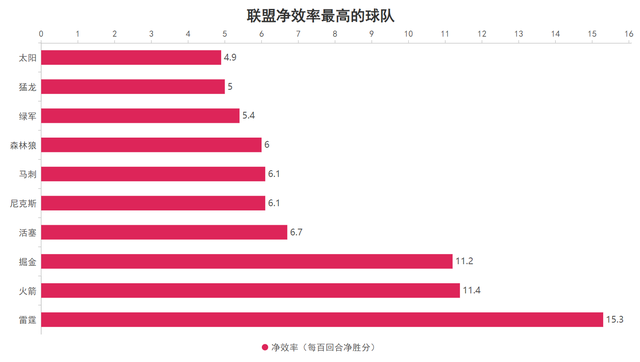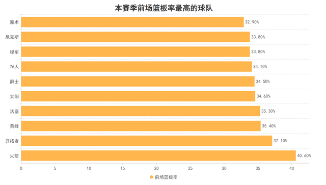 当然,大多数情况对手都会选择补防而不是看着杜兰特得分,再加上本身杜兰特的身高臂展也具备篮板能力,因此火箭本赛季的前场篮板率对比上赛季的36.3%提升到了40.6%同样也是联盟30队的最高,这意味着当火箭投篮不中时有40.6%的篮板球属于火箭队,大量的前场篮板也转化为了更多的得分。
