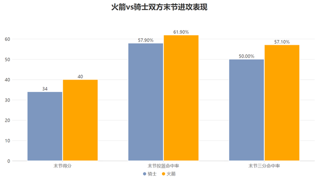 第三个强势的关键是末节的进攻能力。在对阵骑士的比赛中米切尔末节大爆发狂轰了19分,但骑士无论是得分还是两项命中率还是被火箭压过一头,对手的末节进攻已经极其强力但火箭却更胜一筹,这一点在本赛季也是如此: