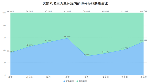 强大的进攻能力是火箭本赛季强势的关键,火箭的多数主力都达到了一种得分受非助攻占比极为均衡的状态,在火箭场均出战20分钟以上的8名主力中,他们的三分线内得分受助攻与非助攻均较为接近,这意味着他们既可以接球完成终结,也可以自主创造不依靠队友助攻的得分,虽然首发控卫范弗利特受伤休战,但火箭变为了多人可持球的进攻模式令对手防不胜防。