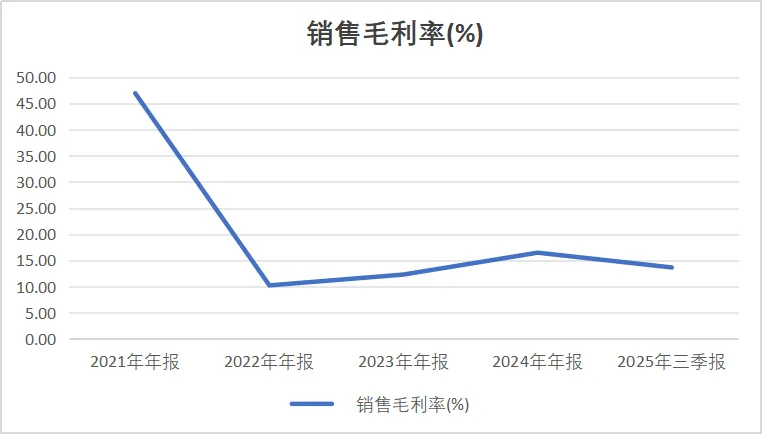 从毛利率看,2020年高达64.40%,2022年跌至10.23%,2024年回升至16.48%,但仍远低于疫情前水平。