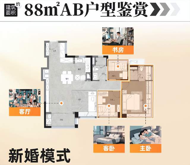 以经典的约88平方米四房两卫户型为例,它展示了强大的空间整合能力。通过入户花园、多功能飘窗等设计,在有限面积内实现了四个功能完整的房间,主卧套房尺度开阔,满足了多代同堂或成长型家庭的基本需求。部分户型更设计了可打开的次卧隔墙,能变身开间约5.7米的“超级方厅”,为社交型家庭提供了弹性变化的空间。