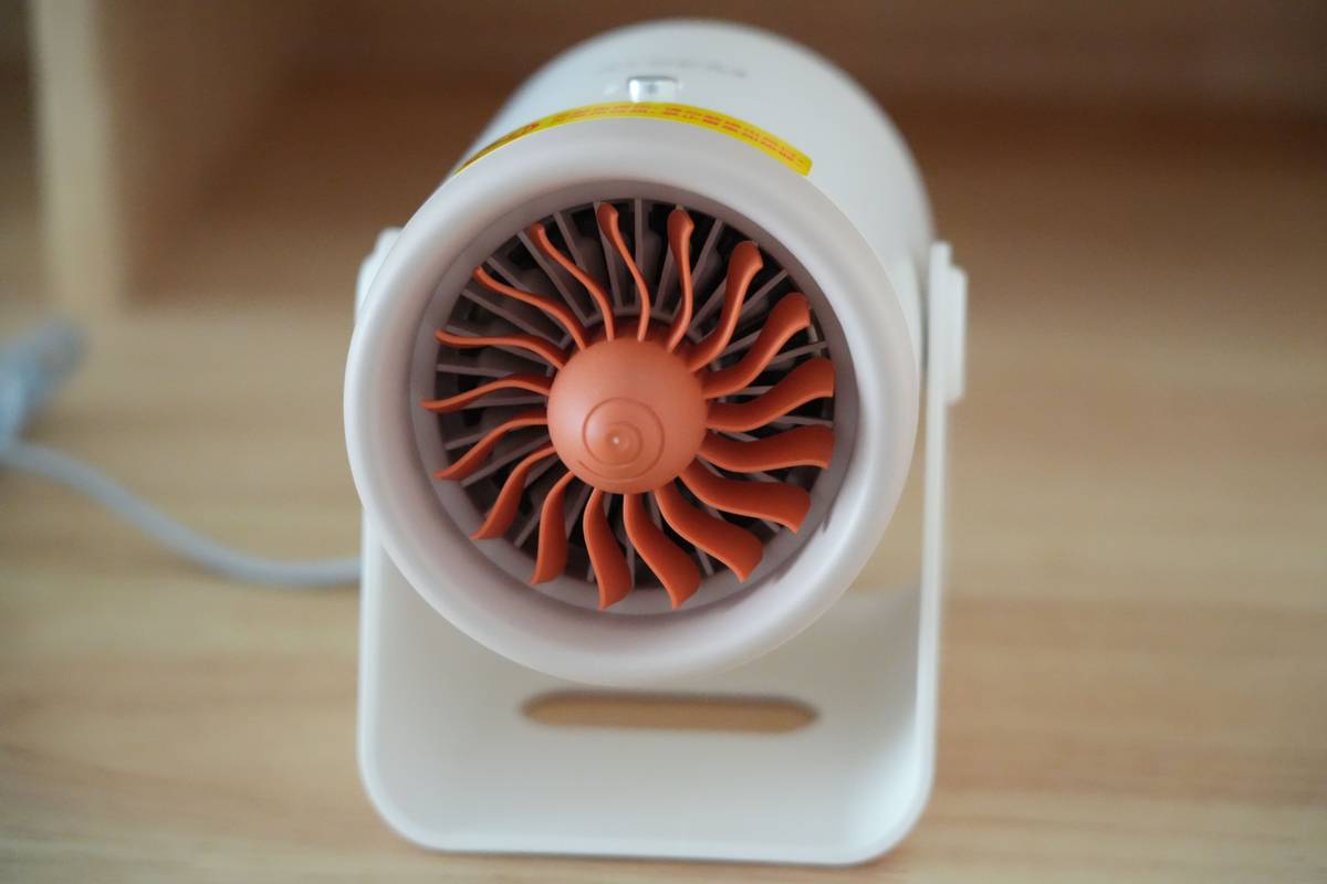 在外观设计上,西圣这次确实用心了,造型上有点飞机引擎的既视感,尤其是前面散热扇的点缀,和飞机的发动机扇叶一模一样,这个设计提升了散热效果的同时,经过扇叶的热空气更加柔和、均匀。而且体积mini,仅仅一个手机大小的占地面积。支架式的设计支持上下50°,方便调整角度,比如可以对准手,让暖流瞬间直达。
