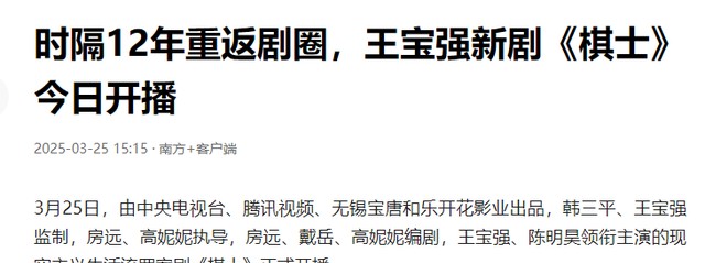 南方+客户端 时隔12年重返剧圈,王宝强新剧《棋士》今日开播