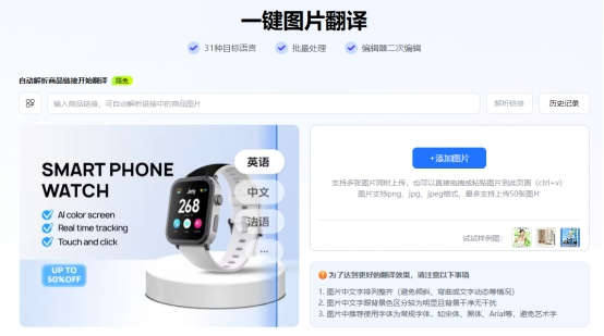 此外,易可图还提供一些辅助功能,如多语言图片翻译和批量图像处理等,可帮助跨境电商卖家快速完成多语种商品图制作与本地化内容输出。