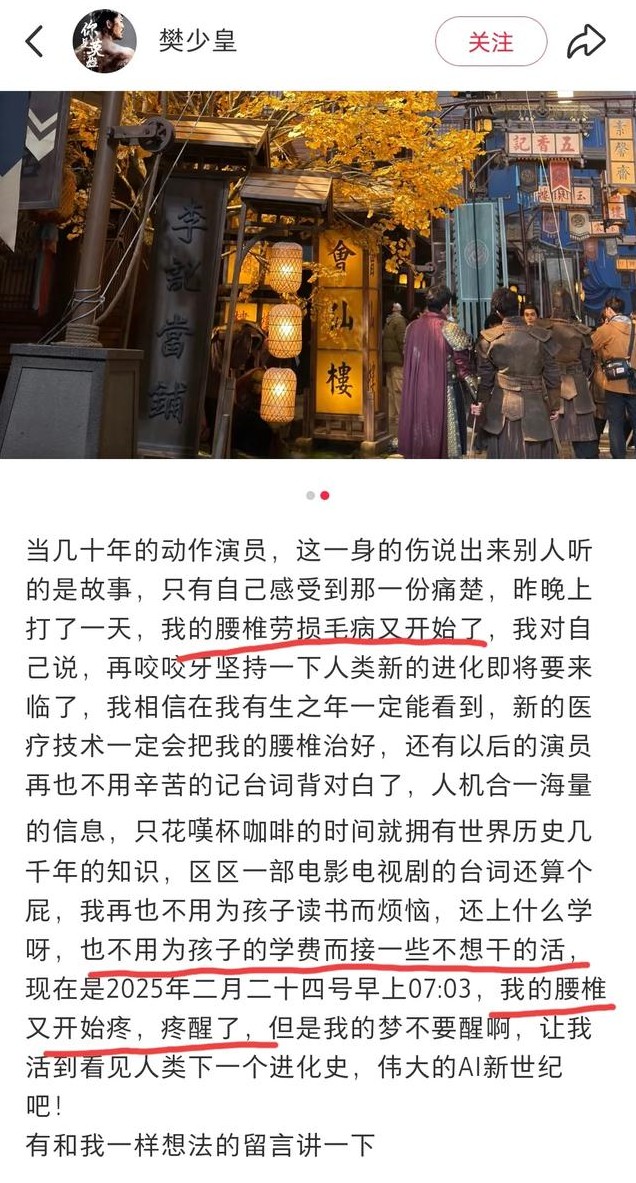 或许是新作电影票房扑街的影响,这段时间,樊少皇的心情也是挺低落。2月24日,樊少皇罕见在其个人社交账号发长文倒苦水,樊少皇作为有几十年经验的动作演员,身上的伤也是不计其数,特别是腰椎劳损问题,让他经常痛到睡不着觉。