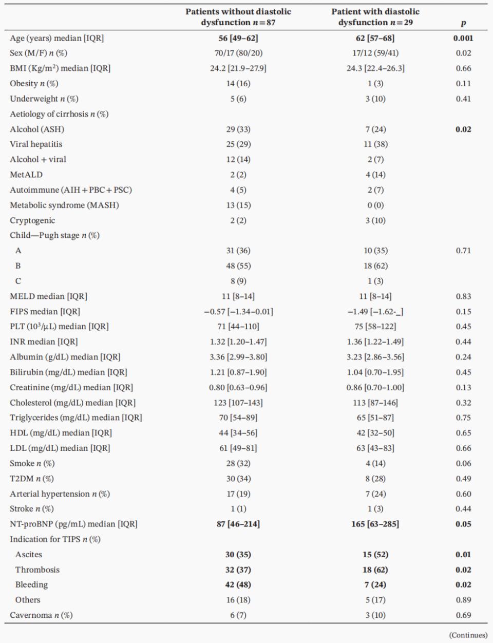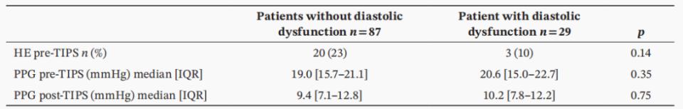 表3. 根据CCC标准,有或无舒张功能障碍的患者在基线时的一般特征、心脏特征和TIPS特征的比较