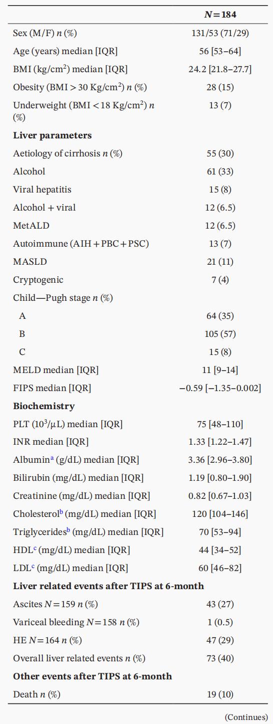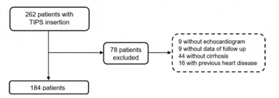 研究设计本研究为一项单中心回顾性队列研究,纳入了2014年1月至2022年12月期间在意大利米兰Niguarda大都会医院接受TIPS治疗的肝硬化患者。研究严格筛选人群:纳入经实验室指标和影像学特征确诊的肝硬化患者。排除标准包括:血管性疾病、非恶性非肝硬化门静脉血栓、已接受肝移植、原发性心脏疾病、缺乏心脏功能评估数据等。最终共纳入184例患者(图1)。