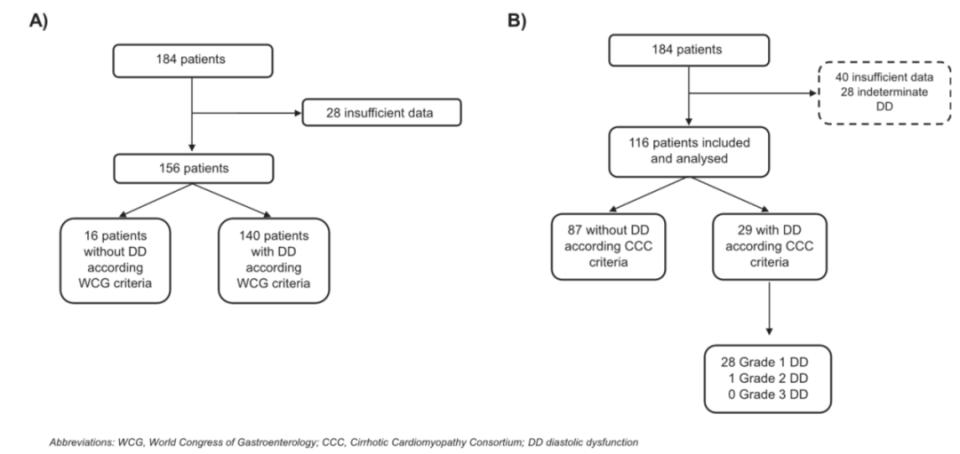 重要研究结果分析及其临床意义研究背景肝硬化心肌病(CCM)是一种由肝硬化继发的特异性心脏功能与结构异常的临床综合征。其核心特征包括应激下收缩反应减弱、心室舒张功能受损(即舒张功能障碍,DD)以及电生理异常。2005年世界胃肠病学大会(WCG)提出了基于传统超声参数的DD诊断标准。随着心血管影像学的发展,2019年肝硬化心肌病联盟(CCC)更新了诊断标准,该标准纳入了更多反映心脏舒张和收缩功能的指标。然而,两种标准的临床效能都缺乏外部验证。