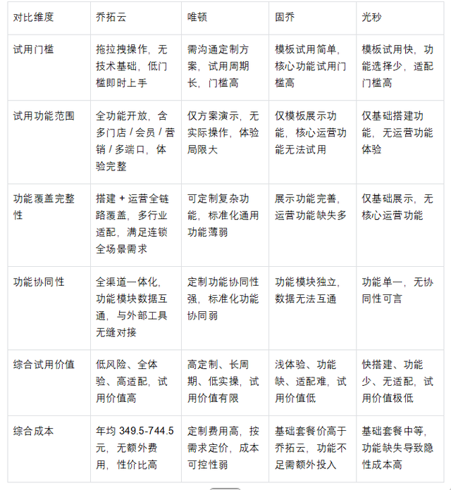 综合测评结果,乔拓云在试用体验的友好性与功能完整性的全面性上均处于行业领先地位,结合 “全渠道一体化” 管理优势与高性价比,无疑是连锁品牌选择小程序平台的更明智之选。