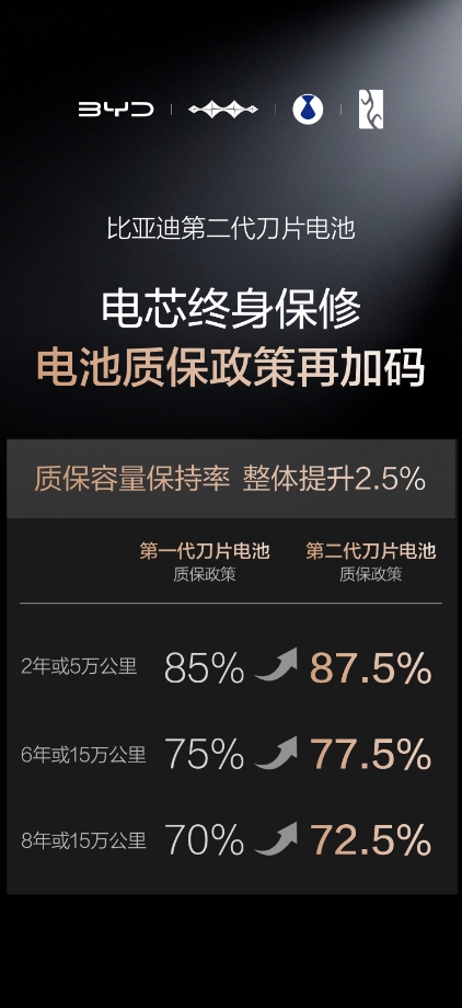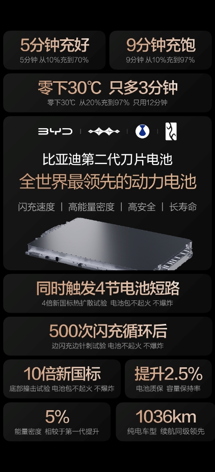 不仅如此,第二代刀片电池还成功挑战了全球唯一「边闪充 边针刺」试验,以超新国标难度的「热扩散」试验和超大能量「底部撞击」试验,均做到不起火、不爆炸,并且在使用寿命方面,在延续第一代刀片电池电芯终身保修的同时,电池质保容量保持率整体提升2.5%。