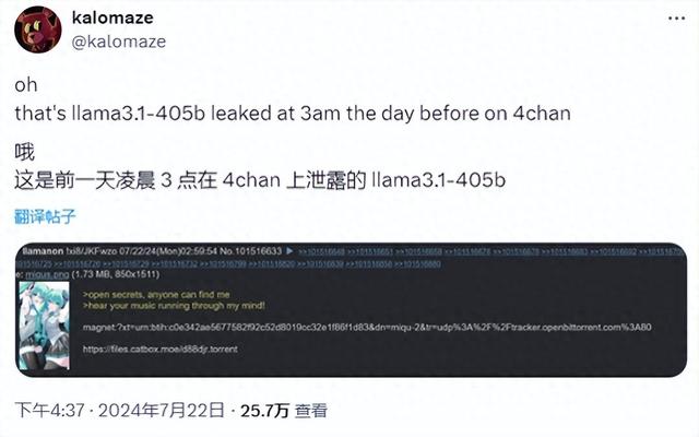 7月23日凌晨,在国外社交媒体上,Meta即将发布的Llama-3.1-405B模型的磁力下载链接遭到泄露。同时其评测数据也遭到曝光。