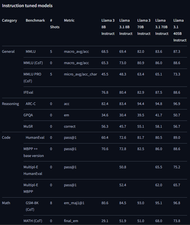 按曝光的测试数据看,Llama-3.1-405B模型具有极高的性能,MMLU-Pro测试项是SOTA,MATH(CoT)项上的分数在Claude3.5-Sonnet和ChatGPT-4o之间。