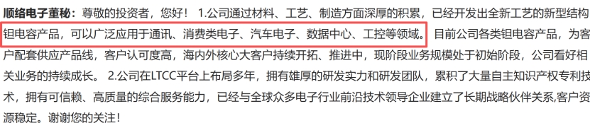 钽电容器:公司持续挖掘并推进电力储能市场、 AI服务器等下游市场应用,同时开发了更小规格更低电性能要求的超级电容产品。