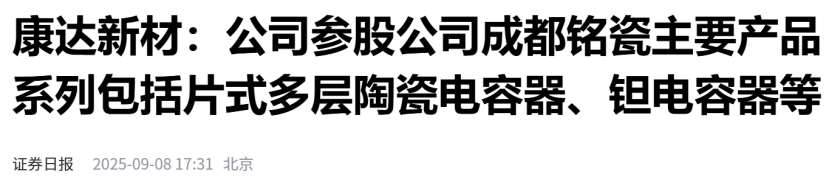 钽电容器:参股公司成都铭瓷主要产品系列包括钽电容器