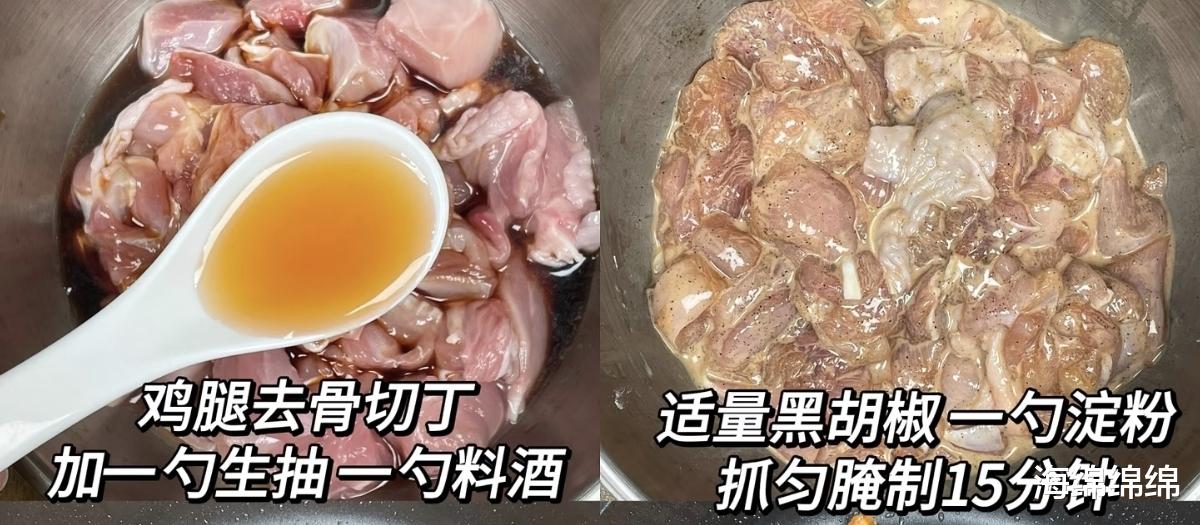 一切美味的起点,始于对鸡腿肉的精心准备。选择新鲜的鸡腿,肉质会比鸡胸更为滑嫩多汁,是这道菜成功的基础。将鸡腿去骨后,切成大小均匀的丁状,这不仅能让鸡肉在后续的烹饪中受热均匀,也方便入口。接下来便是至关重要的腌制环节。在鸡丁中加入一勺生抽提鲜,一勺料酒去腥,再撒上适量的黑胡椒粉增添风味层次,最后放入一勺淀粉,这是让鸡肉锁住水分、口感滑嫩的秘诀。用手充分抓匀,让每一块鸡丁都均匀地裹上调味料,然后静置腌制15分钟,让味道充分渗透。