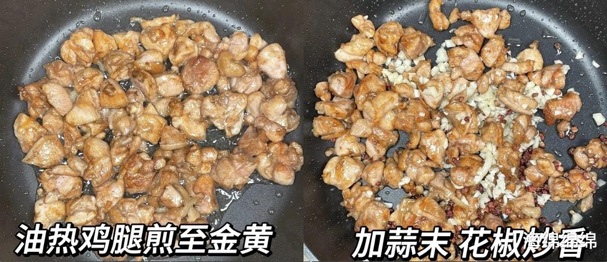 当所有食材准备就绪,便可以开始烹饪。热锅凉油,待油温升高后,将腌好的鸡丁平铺入锅。此时不要急于翻动,让鸡丁在热油中慢慢煎制,直至一面呈现出诱人的金黄色,再翻面煎另一面。这个过程能让鸡丁表面形成一层焦香的脆壳,锁住内部的肉汁,达到“外焦里嫩”的理想效果。当鸡丁全部煎至金黄后,将蒜末和花椒粒撒入锅中,快速翻炒,让蒜香和花椒的麻香瞬间弥漫开来。