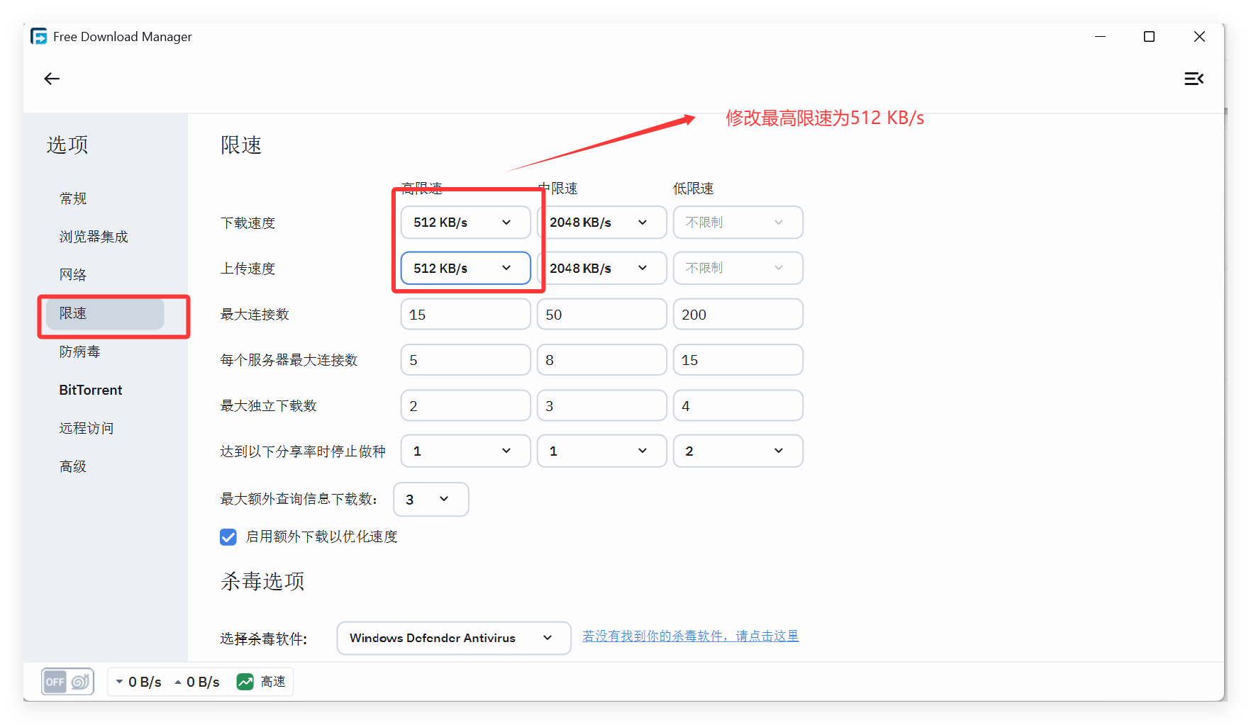 设置方式是:在打开的“选项”中点击“限速”,将高限速改为指定速率,如:512KB/s。