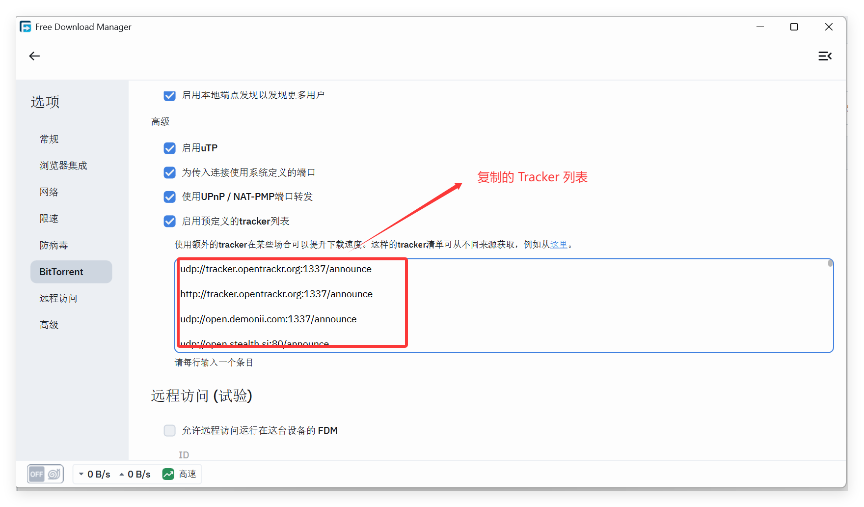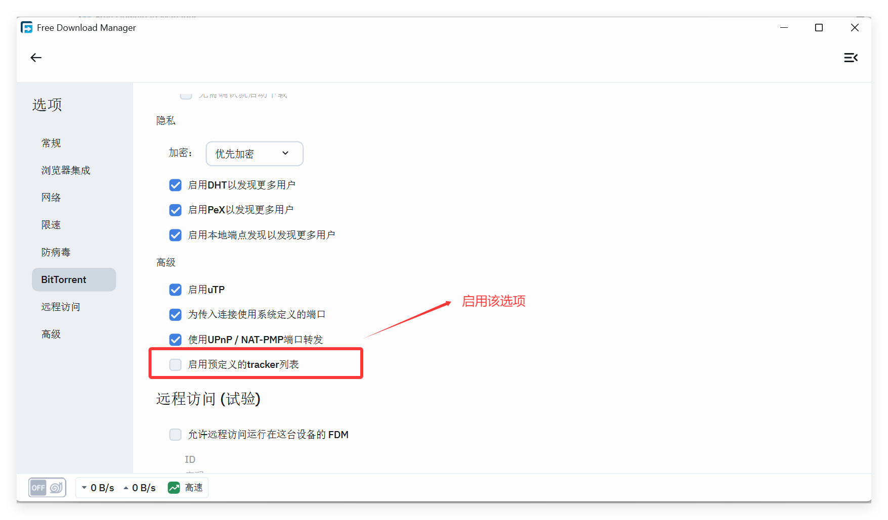 3.4 启用预定义的 Tracker 列表Tracker 与 BT文件的下载息息相关。可以如此理解:BT文件的下载速度取决于其他用户的上传速度,而链接到的上传用户越多,则下载速度越快。而可链接的用户可通过 Tracker进行获取。所以,设置 Tracker列表有助于能在一定程度上提升 BT 文件的下载速度。