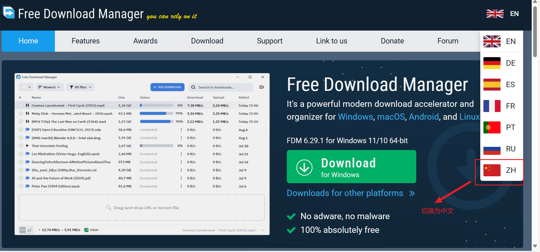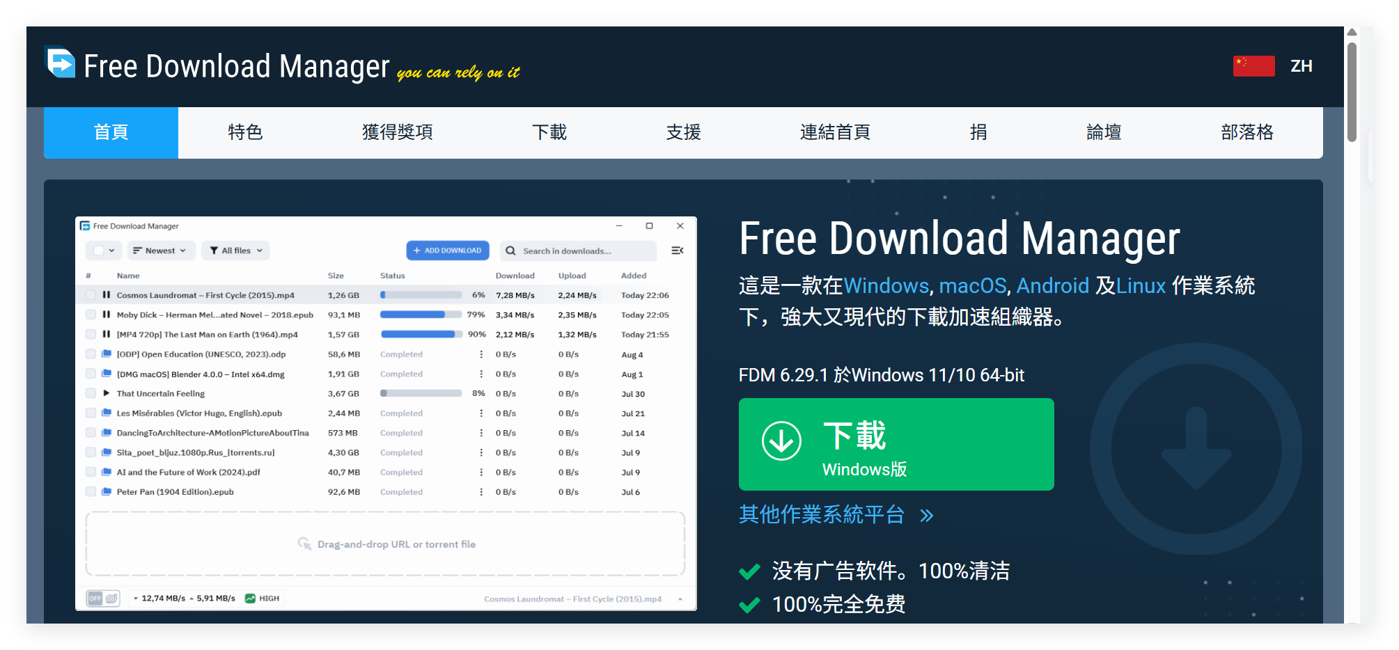 二、安装首先是下载安装包,其官网地址为:https://www.freedownloadmanager.org/zh/: